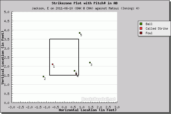 Matsui's walk in the fourth inning, by the way, came on a 3-2 slider that looked for all the world like a strike to me. Here's the strike zone plot from Brooks Baseball: