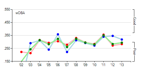 (courtesy FanGraphs, unless they yell at me to stop stealing their shit)Gets on base at a not-unreasonable rate: .334 over the page five years against something like a .324 league average.